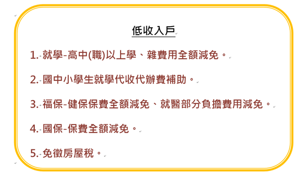 低收入戶與中低收入戶除上述福利外,各縣市政府仍會依不同家庭樣貌及需求提供多元的福利資源。若對於以上申請資格、福利內容有相關問題,歡迎撥打免付費1957福利諮詢專線,由專業社工提供服務~